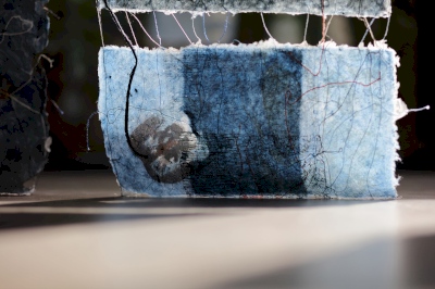 來自美國的藝術家艾婕音(Jane Ingram Allen),也是國際專業策展人,她曾住在台灣長達8年,參與過雲林成龍濕地藝術節的策展與國際評選,今年再回到台灣,將她與潔米 · 塔巴克(Jami Taback)自2021年起合創的作品《In Deep Water》首次帶到美國以外的城市展出,就在本次陸府植深館的《水曰》特展。Jane & Jami以紙纖維與版畫交織的巨幅作品表達她們對於近年美西乾旱野火與台灣風災水患的觀察,傳達氣候變遷帶來的效應與隱憂。